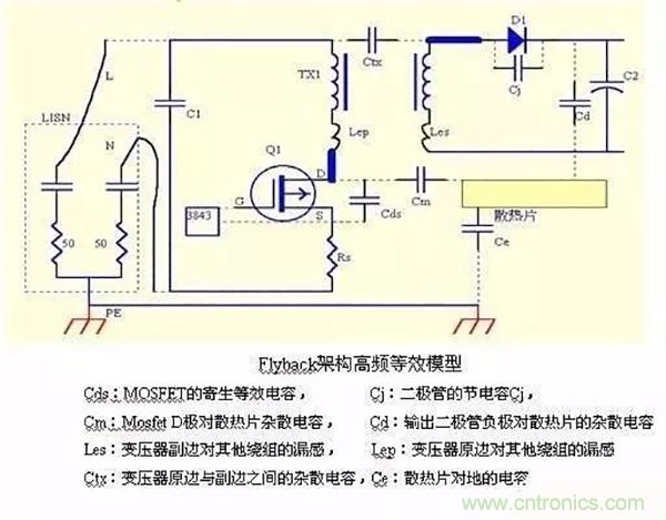 EMC的路徑,當(dāng)然空間輻射是跟環(huán)路有關(guān),環(huán)路也是路徑構(gòu)造成的;分析出反激高頻等效模型,幫助理解EMC形成的機(jī)理;我們的測(cè)試接收設(shè)備會(huì)從L,N端接收傳導(dǎo),為了減小接收的干擾,就必須讓干擾通過地回路流通而不從L,N端口流向接收設(shè)備;這時(shí)候我們的EMI電感以及Y電容通過阻抗匹配就可以實(shí)現(xiàn);另外原邊的干擾可以通過原副邊Y電容,變壓器雜散電容以及大地耦合到副邊,形成更多的回路;當(dāng)然一些結(jié)電容參數(shù),如MOS管結(jié)電容,散熱器結(jié)電容也能構(gòu)成流通路徑;