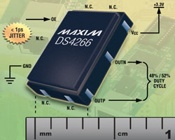 DS4266的尺寸比傳統(tǒng)的基于SAW的晶體振蕩器和三次泛音晶體振蕩器小55%,而且上述振蕩器通常無法達到優(yōu)于48%/52%的占空比。DS4266是一款低噪聲、基于LC PLL的振蕩器,采用Maxim專有的SiGe工藝制造。該款晶振采用了基頻AT切晶體技術,無需諧波晶體即可實現(xiàn)高頻輸出。這種獨特的方法省去了三次泛音設計中常見的雜散工作模式,且整體穩(wěn)定性優(yōu)于基于SAW的振蕩器(> ±100ppm)。DS4266具有極低的老化系數(shù)(10年小于±7ppm),以及優(yōu)異的、考慮了老化、電壓、溫度、負載和初始容差等因素的頻率穩(wěn)定度(< ±50ppm)。