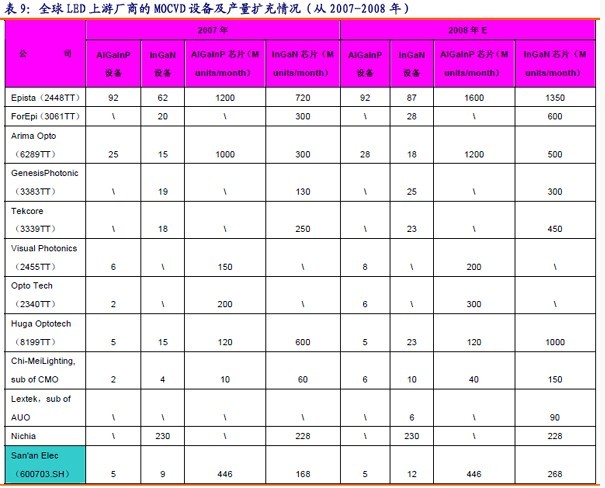 我們以截止2007年底為止,對(duì)三安光電和臺(tái)灣上游外延廠商的MOCVD設(shè)備及外延片、芯片產(chǎn)能進(jìn)行比較。