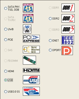QualiPHY軟件集成了多種串行協(xié)議,不僅支持USB2.0協(xié)議,而支持其他流行的串行協(xié)議諸如SATA、UWB、PCIE、SAS、FBDIMM、HDMI、DDR2、ENET等,如下圖所示。不同的串行協(xié)議采用相同的用戶界面和操作方法,工程師無需重復(fù)學(xué)習(xí),舉一反三即可快速掌握全部協(xié)議的一致性測(cè)試流程。