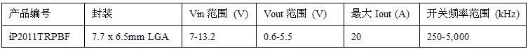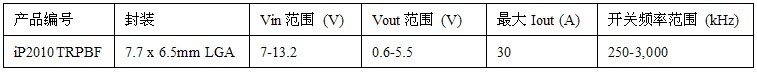 iP2010的輸入電壓范圍為7V至13.2V,輸出電壓范圍則為0.6V至5.5V,輸出電流高達30A。這個器件最高運行頻率為3MHz。在5MHz運行時,與iP2010引腳兼容的iP2011備有相同的輸入和輸出電壓范圍,但后者經(jīng)過優(yōu)化,從而使最高輸出電流高達20A。通過以通用占位面積提供多種電流額定值器件,IR提供的靈活性能夠滿足不同客戶對電流水平、性能和成本的要求。
