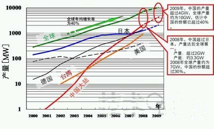 - 2000年以后,全球太陽能電池產(chǎn)量以年均40%左右的速度增長