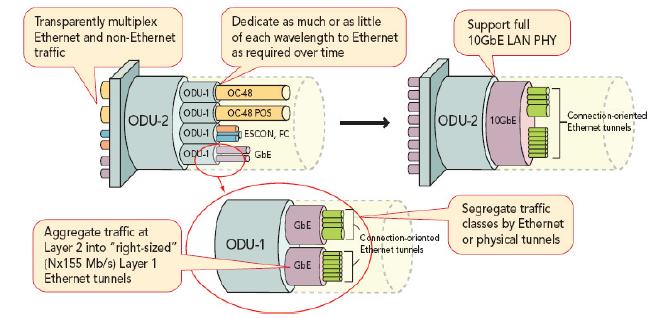 OTN含有的網(wǎng)絡(luò)功能和協(xié)議要求能夠滿足這些需求,以系統(tǒng)方式在光介質(zhì)上傳輸信息。本文重點(diǎn)介紹通過(guò)光纖承載傳送網(wǎng)和以太網(wǎng)載荷。建立同步數(shù)字體系(SDH)等OTN機(jī)制也在這一定義范圍之內(nèi),但是我們主要關(guān)注LAN到WAN的應(yīng)用,特別是40GbE和100GbE應(yīng)用(802.3ba)。出于這一標(biāo)準(zhǔn)化以及工作規(guī)劃的目的,所有OTN新功能以及相關(guān)技術(shù)都被認(rèn)為是電信標(biāo)準(zhǔn)局(ITU-T標(biāo)準(zhǔn))的工作范疇。