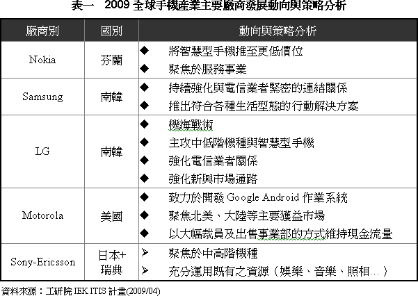 受金融風(fēng)暴影響,2009年全球手機(jī)市場(chǎng)衰退已成定局,為了因應(yīng)詭譎多變的局勢(shì),前五大手機(jī)品牌業(yè)者紛紛調(diào)整其市場(chǎng)策略,Nokia以完整布局求穩(wěn)定發(fā)展,Motorola與Sony-Ercisson則主要以撙節(jié)開(kāi)銷(xiāo)的方式熬過(guò)寒冬,相較之下韓系業(yè)者則以較為積極的方式進(jìn)行布局。