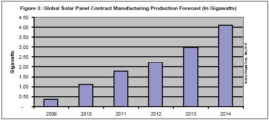 2010年合同制造商將生產(chǎn)1.1GW的太陽能電池板,比2009年時的369MW大增200%。其余的生產(chǎn)任務將由專門的太陽能電池板廠商以及其它企業(yè)承擔。2014年合同制造商生產(chǎn)的太陽能電池板將比2010年增長近三倍,達到4.1GW。