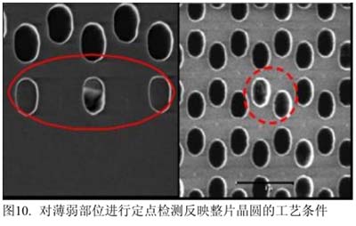 自動(dòng)工藝檢測技術(shù)是對(duì)電子束檢測技術(shù)補(bǔ)充。在實(shí)際生產(chǎn)過程中,常常能發(fā)現(xiàn)通孔刻蝕的一些系統(tǒng)性缺陷,它主要由于刻蝕設(shè)備及其工藝在調(diào)試過程中還沒達(dá)到最好的工藝窗口,或者工藝窗口的漂移使刻蝕設(shè)備的一些薄弱部位提前顯現(xiàn)在通孔刻蝕工藝過程中。實(shí)驗(yàn)過程中通過對(duì)一顆產(chǎn)品的薄弱部位進(jìn)行定點(diǎn)檢測,來反映整片晶圓的工藝條件(如圖10所示)。