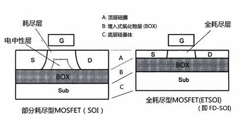 體硅CMOS技術(shù)走到22nm之后,特征尺寸已很難繼續(xù)微縮,急需革新技術(shù)來維持進(jìn)一步發(fā)展。在候選技術(shù)之中,F(xiàn)DSOI(Fully Depleted SOI,全耗盡SOI)技術(shù)極具競爭力。對(duì)于FDSOI晶體管,硅薄膜自然地限定了源漏結(jié)深,同時(shí)也限定了源漏結(jié)耗盡區(qū),從而可改善DIBL(Drain Induced Barrier Lowering,漏致勢壘降低)等短溝道效應(yīng),改善器件的亞閾特性,降低電路的靜態(tài)功耗。此外,F(xiàn)DSOI晶體管無需溝道摻雜,可以避免RDF(Random Dopants FluctuatiON,隨機(jī)摻雜漲落)等效應(yīng),從而保持穩(wěn)定的閾值電壓,同時(shí)還可以避免因摻雜而引起的遷移率退化。