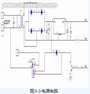 電源部分為單片機(jī)提供+5V的直流穩(wěn)壓源,并且通過(guò)降壓、整流、濾波之后的+14V電壓對(duì)繼電器進(jìn)行供電,通過(guò)控制三極管射極的導(dǎo)通與否來(lái)控制繼電器的工作狀態(tài)。電源電路原理圖如圖3-3所示:
