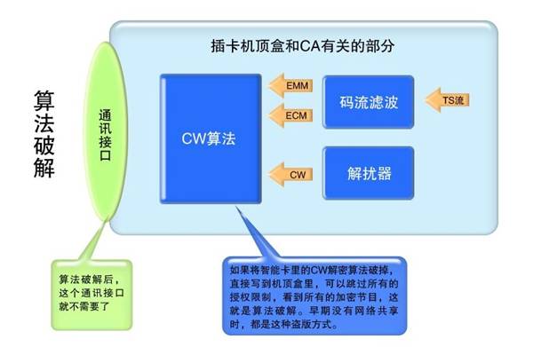 圖六是傳統(tǒng)CA的破解步驟,只要解加密的CW算法被攻破,整個CA就算完了,就可以在此基礎(chǔ)上完成圖二中的算法破解和圖四、圖五中的網(wǎng)絡共享。