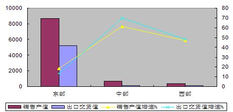西部地區(qū)銷售產(chǎn)值和出口交貨值分別增長46.9%和48%,出口高出行業(yè)平均水平25.3和33.2個百分點。四川、重慶正逐步成為行業(yè)新的增長極,銷售產(chǎn)值分別增長45%和162.5%。
