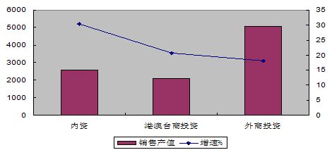 三資企業(yè)實現(xiàn)銷售產(chǎn)值7132億元,增長18.7%;出口交貨值4932億元,增長14.4%,分別低于行業(yè)平均水平2.9和0.4個百分點。其中港澳臺企業(yè)銷售產(chǎn)值增長20.7%,外商投資企業(yè)增長18.0%。