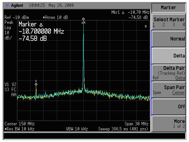 屏幕圖像下端的黃色跡線表示在輸入混頻器被過(guò)度激勵(lì)時(shí)的內(nèi)部失真。衰減為零。藍(lán)色跡線表示當(dāng)衰減設(shè)置為10dB時(shí),雜散信號(hào)所減少的電平。
