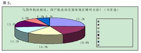 據(jù)中國(guó)機(jī)床工具工業(yè)協(xié)會(huì)統(tǒng)計(jì),2010年我國(guó)機(jī)床工具產(chǎn)品進(jìn)口總額為157.2億美元,同比增長(zhǎng)62.0%,國(guó)內(nèi)機(jī)床進(jìn)口額與歷史最高的2008年同期相比還增長(zhǎng)了27.8%,創(chuàng)歷史新高。進(jìn)口的增長(zhǎng)迅猛表明國(guó)內(nèi)機(jī)床與國(guó)外機(jī)床的差距依然很大。本次調(diào)查報(bào)告顯示,中外機(jī)床的差距主要體現(xiàn)在三個(gè)方面:加工精度(25.2%)、可靠性(18.8%)、機(jī)床內(nèi)部電、氣、控等配置(16.5%)。緊跟其后的是加工速度和外形方面的色彩、精美程度等,均占13.1%(詳見圖5)。由此可見,技術(shù)尤其是對(duì)精準(zhǔn)度和可靠度是國(guó)外機(jī)床領(lǐng)先國(guó)內(nèi)機(jī)床的優(yōu)勢(shì)來(lái)源。另外,對(duì)外形的關(guān)注也是近年來(lái)客戶在使用方面出現(xiàn)的一種新口味。