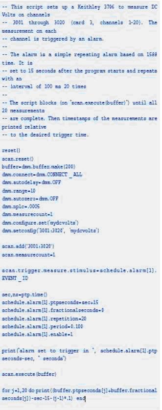 使用分立的控制器,基于腳本的儀器當然可用于常規(guī)測試系統(tǒng)。這樣做的詳細步驟可能有所不同,這取決于制造商選擇如何實現(xiàn)腳本。吉時利支持TSP的儀器能輕松地配合單獨的控制器使用。如前面詳細介紹的,指令的名稱和句法有所不同,就像執(zhí)行查詢獲取狀態(tài)和數(shù)據(jù)的語句。但總的來說,這種改變很小并且任何熟悉儀器編程的人都能很輕松地適應。