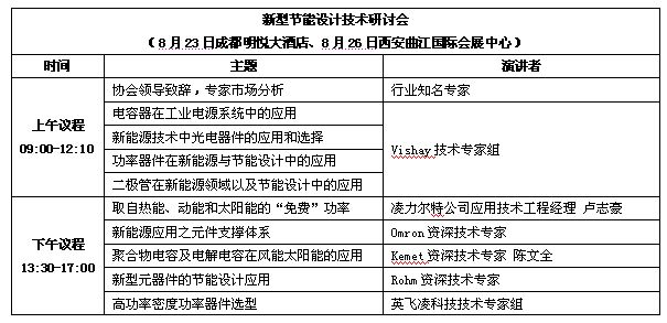 [page]新型節(jié)能設(shè)計技術(shù)研討會以風(fēng)能太陽能發(fā)電與節(jié)能設(shè)計為主題,圍繞智能電源、逆變器設(shè)計、智能控制、馬達(dá)控制、新型電子元器件與模塊的應(yīng)用展開探討,來自知名廠商的技術(shù)專家將分享逆變器設(shè)計、馬達(dá)控制、變頻技術(shù)、電力電子技術(shù)在風(fēng)能/太陽能、工業(yè)電子、通信設(shè)備、軍工上的應(yīng)用解決方案和節(jié)能設(shè)計技術(shù)。