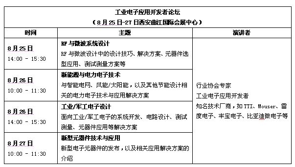 作為2011西部電子論壇中的一個新環(huán)節(jié),論壇組委會將聯(lián)合2011中國(西安)電子展,同期展會2號館推出工業(yè)電子應(yīng)用開發(fā)者論壇,該活動是2011中國(西安)電子展中的核心活動之一,聚焦以西安為中心的電子行業(yè)最為關(guān)注的RF微波、新能源以及工業(yè)應(yīng)用等主題,邀請研發(fā)一線的工程師與領(lǐng)先的技術(shù)廠商代表同臺展示設(shè)計新技術(shù)、新思路、新方案,為工業(yè)電子應(yīng)用開發(fā)者提供深入、平等交流的機(jī)會。