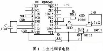 圖3為頻率調(diào)節(jié)電路。通過調(diào)節(jié)CD4046外接電位器POTll,控制VCO輸出脈沖的頻率,根據(jù)設(shè)計要求,該電路將輸出一個變化范圍在1~6 kHz之間的脈沖信號PLS,將該信號作為CPLD的輸入信號。在CPLD內(nèi)部通過計數(shù)延時和占空比設(shè)計要求,最終輸出一個頻率在400~3 000 Hz之間符合占空比要求的逆變觸發(fā)信號,并可通過POT11調(diào)節(jié)該信號的頻率。