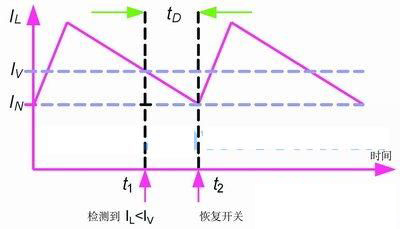 一般而言,通常采用比較器來(lái)檢測(cè)IL是否超出IV,以決定關(guān)斷或重新開通??墒?比較器會(huì)帶來(lái)延時(shí)tD,影響閾值的有效值。如圖2所示,比較器在t1時(shí)刻檢測(cè)到IL< p> V,可是偶遇延時(shí)tD,開關(guān)會(huì)在t2時(shí)刻被恢復(fù)?;谶@個(gè)原因,有效閥值IN便會(huì)低于IV,這樣,實(shí)際的輸出IOUT(CL)為: