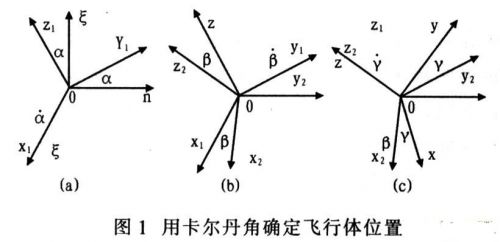 在對(duì)剛體的轉(zhuǎn)動(dòng)運(yùn)動(dòng)進(jìn)行解析描述時(shí).常應(yīng)用歐拉角或卡爾丹角??柕そ沁m用于姿態(tài)角變化較小的場(chǎng)合,因此.用卡爾丹角進(jìn)行描述。取初始時(shí)刻飛行體坐標(biāo)系Oξηζ為固定坐標(biāo)系,0xyz為與飛行體固結(jié)的動(dòng)坐標(biāo)系??柕そ沁x取的方法是,首先繞ξ軸轉(zhuǎn)過(guò)α角,到達(dá)0x1y1zl的位置;再繞y1軸轉(zhuǎn)動(dòng)β角,到達(dá)0x2y2z2的位置;再繞z2軸轉(zhuǎn)動(dòng)γ角,到達(dá)0xyz的位置。轉(zhuǎn)動(dòng)關(guān)系如圖l所示。