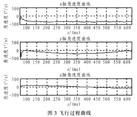 存儲(chǔ)測(cè)試系統(tǒng)已經(jīng)成功應(yīng)用于某小型飛行體的試驗(yàn),成功獲得了測(cè)試數(shù)據(jù)。下面是實(shí)測(cè)曲線及其分析,x軸為自轉(zhuǎn)軸,z軸為飛行方向。實(shí)測(cè)飛行過(guò)程角速度信號(hào)如圖3所示,圖3中,3個(gè)軸的角速度曲線在70 ms處均有一個(gè)小鼓包,為陀螺的加速度效應(yīng)在曲線上的表現(xiàn)。