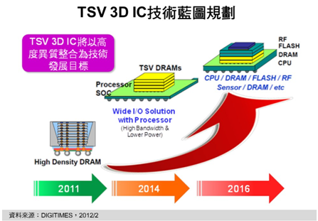 綜合各主要芯片制造商技術(shù)藍(lán)圖規(guī)畫,2011年TSV 3D IC是以同質(zhì)整合的高容量DRAM產(chǎn)品為主,至2014年,除將以多顆DRAM堆棧外,尚會整合一顆中央處理器或應(yīng)用處理器的異質(zhì)整合產(chǎn)品。柴煥欣也預(yù)估,要至2016年,才有機(jī)會達(dá)到將DRAM、RF、NAND Flash、CPU等各種不同的半導(dǎo)體組件以TSV 3D IC技術(shù)整合于同1顆IC之中異質(zhì)整合水平。