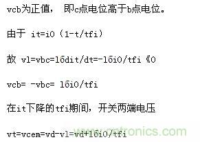 因此,在關(guān)斷過程一開始,vt立即從零上升到vcem,it在從i0下降至零期間,vt=vcem不變。直到it=0、id=i0以后,vt才下降為電源電壓vd,如圖5(b)所示。vcem超過vd的數(shù)值取決于lб、tfi和負(fù)載電流i0,顯然過快的電流下降率di/dt(即tfi小)、過大的雜散電感l(wèi)б或負(fù)載電流過大都會(huì)引起關(guān)斷時(shí)元件嚴(yán)重過電壓,且伴隨著很大的功耗。