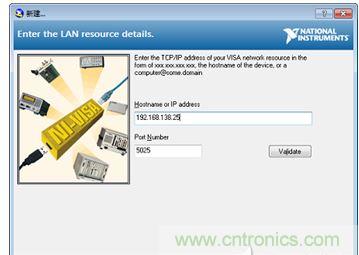 啟動Masurement & Automation Explorer軟件,選擇設(shè)備和接口,在添加網(wǎng)絡設(shè)備中,使用Manual Entry of Raw Scoket(手動輸入原始SOCKET)方式連接,ZDS2024示波器采用端口號5025來接收SCPI命令。如圖2和圖3所示。設(shè)置好后,可進行測試,確保連接成功。