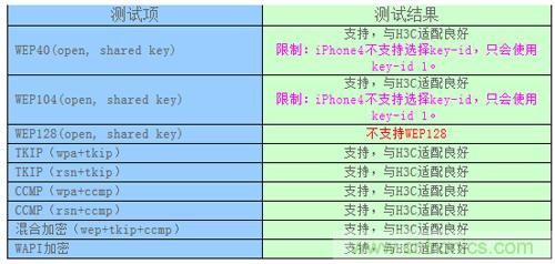從測試結(jié)果可以看出:除了WEP128,iPhone 4對各種加密方式均能很好的支持,在采用混合加密的H3C WLAN網(wǎng)絡(luò)中也能很好的相互適配。
