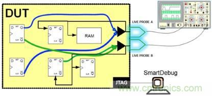 -現(xiàn)場探頭:允許采用兩個專用探頭,經(jīng)配置用于觀察邏輯元件中任何輸入或輸出的探測點(圖1)。然后,探頭數(shù)據(jù)可發(fā)送到示波器或甚至重新引導回到FPGA結構,驅動內(nèi)部邏輯分析儀。這些探測點是實時動態(tài)的。探測點可以通過軟件在運行中更改,不需要把FPGA重新編譯或重新編程。