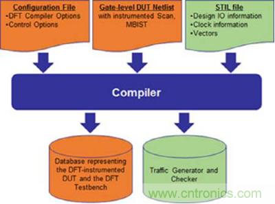 用于硬件加速仿真的 DFT App 改變了硬件加速器在開發(fā)階段的編譯流程和運(yùn)行時(shí)間。這將為編譯流程和運(yùn)行時(shí)間帶來重大變化。具有掃描和 MBIST 結(jié)構(gòu)的門級(jí)設(shè)計(jì)被載入硬件加速仿真的編譯器。編譯器創(chuàng)建了用于讀取Stil文件中測(cè)試向量的測(cè)試結(jié)構(gòu),然后將這些向量應(yīng)用到可綜合的待測(cè)器件 (DUT) 以及進(jìn)行輸出比較。編譯器將用戶網(wǎng)表重新編譯并合成到一個(gè)能夠兼容硬件加速仿真的結(jié)構(gòu)化描述中。編譯器創(chuàng)建了用于讀取Stil文件中測(cè)試向量的測(cè)試結(jié)構(gòu),然后將這些測(cè)試向量用到可綜合的待測(cè)設(shè)計(jì)上,再將網(wǎng)表重新編譯并合成到一個(gè)能夠兼容硬件加速仿真的結(jié)構(gòu)化描述中。測(cè)試控制架構(gòu)還包括比較輸出的機(jī)制。參見圖 1。