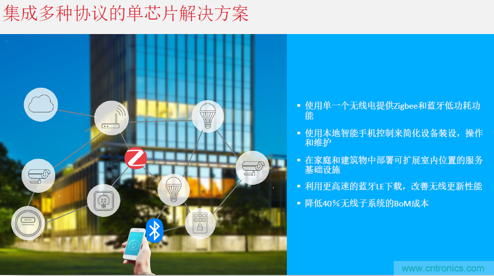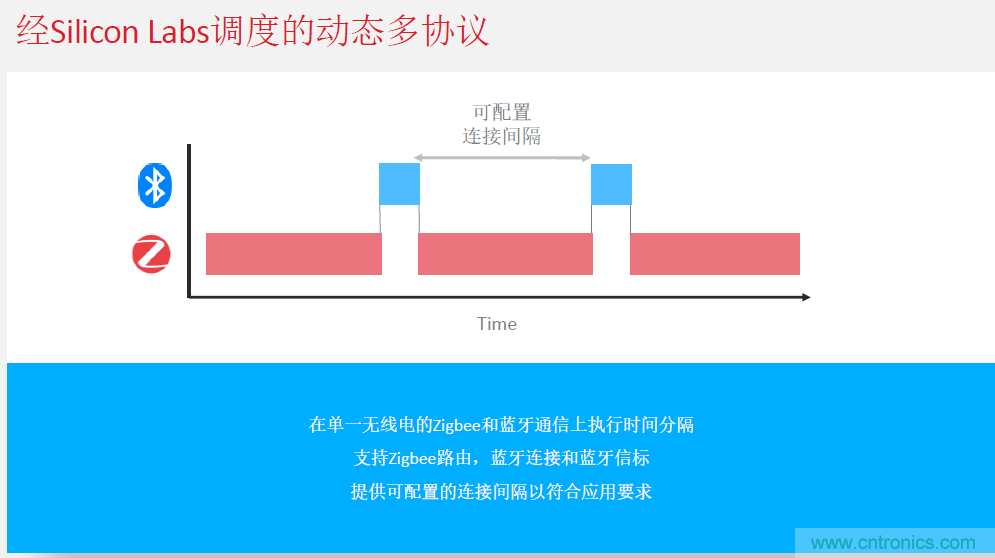 Silicon Labs在芯片設(shè)計時,就提出了動態(tài)多協(xié)議的做法。即:在單一無線電的Zigbee和藍(lán)牙通信上執(zhí)行時間分隔,支持Zigbee路由、藍(lán)牙連接和藍(lán)牙信標(biāo)。為工程師提供可配置的連接間隔,以符合應(yīng)用要求。陳雄基表示,目前這種做法據(jù)他所知Silicon Labs是業(yè)界唯一已經(jīng)在技術(shù)上實(shí)現(xiàn)的公司。