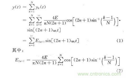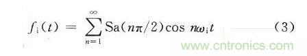 首先對量化過程進行分析,現(xiàn)假設基帶輸入信號為一個正弦信號gi(t)=Esinωit,量化位數(shù)為N,經過量化后的信號可用階梯波y(t)表示,y(t)可以被認為是N對矩形波的疊加。如果A/D變換的量化位數(shù)為m,那么正或負半周的量化臺階數(shù)為N=2m-1。階梯波的表達式為: