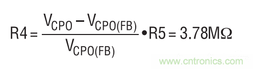 串聯(lián)連接的超級電容器上的滿充電電壓被設(shè)定為5V。這是利用位于 CPO 引腳與 CPO_FB 引腳之間的一個分壓器網(wǎng)絡(luò)完成的。R5 設(shè)定為 1.21M,并計算 R4阻值。VCPO(FB)為1.21V。