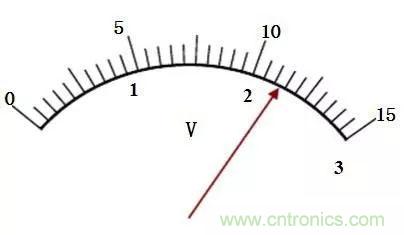 若是0~15V檔,最小分度值為0.5V, 半格為0.25V,通??晒雷x為0.2V或0.3V。(因有效數字出現在以V為單位的十分位上)。圖中讀數應為 11. 2V或11.3V。