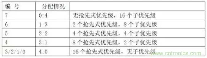 兩種優(yōu)先級由4位二進制位決定。分配下來有十六種情況: