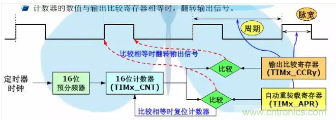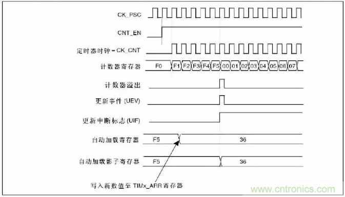 實際起作用的是影子寄存器,而程序員操縱的則是自動裝載寄存器。如果APPE位使能,表明自動裝載寄存器的值在下一次更新事件發(fā)生后才寫入新值。