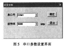 要實(shí)現(xiàn)計算機(jī)串行通信的功能,一種較為簡便的方法是使用MSComm(Microsoft Communication Control)通信控件,它提供了標(biāo)準(zhǔn)的事件處理函數(shù)過程,是微軟公司開發(fā)的專門用于串行通信的控件。它是高級語言編寫的串行通信程序和PC串口之間的橋粱。本系統(tǒng)采用得就是這種方法。設(shè)置控件的屬性。添加控件的響應(yīng)代碼。就可以使串口按照要求進(jìn)行工作。在這個界面,可以進(jìn)行串口號和波特率的設(shè)置。通信參效設(shè)置界面如圖5所示。