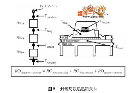 散熱設(shè)計(jì)是LED光源區(qū)別于傳統(tǒng)光源的課題之一。傳統(tǒng)燈具產(chǎn)生的熱遠(yuǎn)高于LED,但傳統(tǒng)燈具不會(huì)因?yàn)楦邷囟档推涔庠摧敵瞿芰?,但LED的光輸出卻會(huì)隨著本身接口(Junction, PN接口)溫度的升高而下降,如圖8所示。而其產(chǎn)生的熱如何散除到外界環(huán)境與其封裝結(jié)構(gòu)材料息息相關(guān),牽涉到使用的散熱材料與相關(guān)外型,關(guān)系如圖9所示,其中熱阻的概念,代表輸入W功率時(shí),需要提高多少K溫度才足以散熱。以現(xiàn)有的封裝技術(shù)最高可允許LED操作在185℃(Lumiled?。耍玻?,但一般因?yàn)榉庋b膠材的關(guān)系,可允許的操作溫度約在125℃,除了考慮光源輸出效率之外,亦考慮封裝膠材的變質(zhì)(樹(shù)脂類材料在高溫有老化現(xiàn)象)。