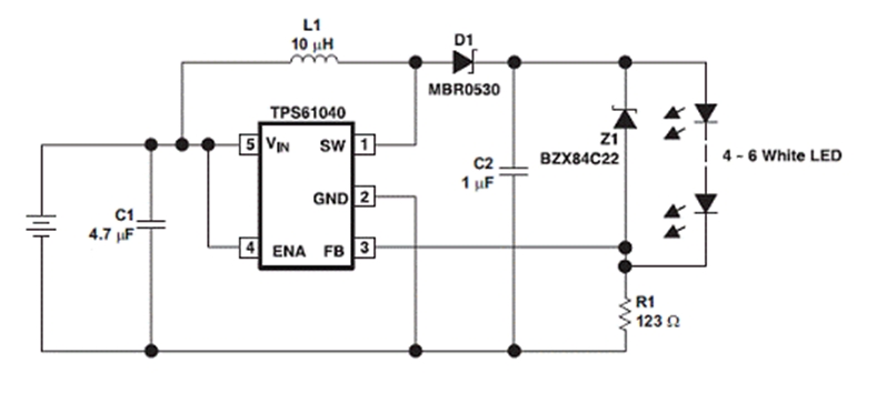 以下電路可生成 101mA 的恒定電流,能為 PDA 和數(shù)碼相機等便攜式應用驅動高達 6 個白色 LED">LED。其輸入電壓工作范圍為 1.8 V 至 6 V,可以采用兩節(jié)堿性電池或鎳氫電池輸入(1.8 V 到 ~3 V)、三節(jié)堿性電池或鎳氫電池輸入(2.7 V 到 ~4.8 V)以及單體鋰離子電池輸入(3 V~4.2 V)。這種升壓轉換器采用 R1 來設置流過 LED">LED 的恒定電流。TPS61040 產(chǎn)品說明書 (SLVS413) 給出了本電路的詳細描述。