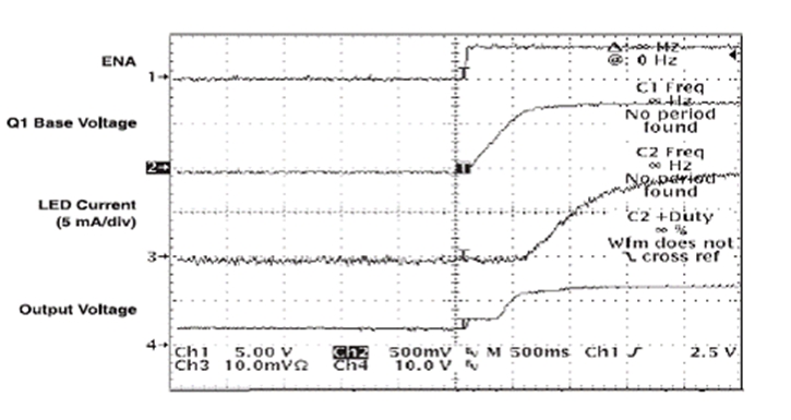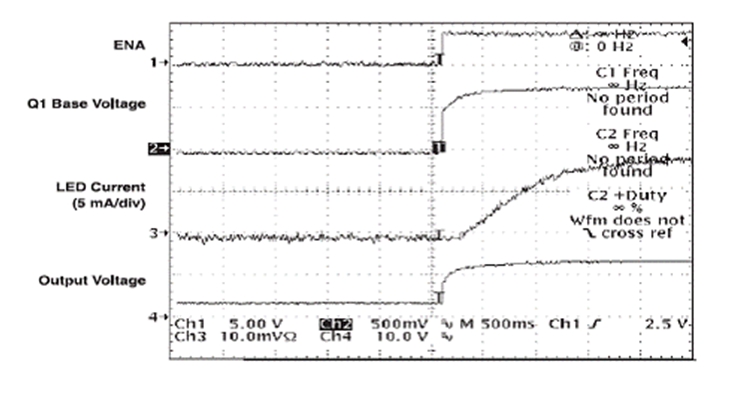 應用使能信號 (enable signal) 時,R3 將慢慢給 C3 充電,此舉會慢慢開啟 Q1。TPS61040 會通過 D2 被立即啟用。在電路閉合時,F(xiàn)B 到接地的初始電阻極高,從而將 LED">LED 電流限制為 0 mA。隨著 Q1 慢慢開啟,有效電阻逐漸下降,電阻的下降與 LED">LED 電流的升高有直接的關系。LED">LED 從亮度為 0% 變?yōu)?100% 的亮度,需時 1 到 2 秒鐘,具體的時間長短取決于選定的時間常數(shù)。圖 3 顯示了電路閉合時的相關波形。