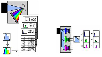 LED的顏色特性主要包括色品坐標(biāo)、主波長、色純度、色溫及顯色性等,LED的顏色特性對(duì)白光LED尤為重要。 現(xiàn)有的顏色特性測試方法有分光光度法和積分法。如圖7所示:分光光度法是通過單色儀分光測得LED光譜功率分布,之后利用色度加權(quán)函數(shù)積分獲得對(duì)應(yīng)色度參數(shù);積分法是利用特定濾色片配合光電探測器直接測得色度參數(shù);分光光度法的準(zhǔn)確性要大大高于積分法。