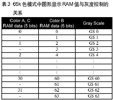 在65K色模式,情形有些不同。如表3所示,從GS0到GS63的64階灰度,有一顏色(顏色B)由6bit組成;而從GS0,GS2,.....到GS62,另外兩個(gè)顏色(顏色A和C)只有5-bit,只能呈現(xiàn)32階灰度。