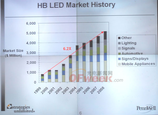 2009年LED持續(xù)擴(kuò)大其在niche和通用照明領(lǐng)域的滲透率,2008年增長55%,2009年由于受經(jīng)濟(jì)衰退的影響估計(jì)將增長15%。