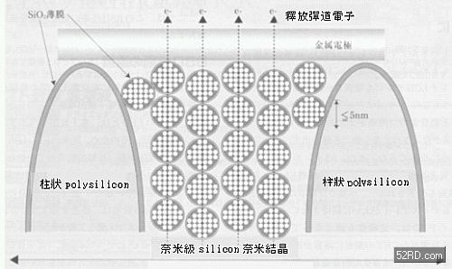 接著在玻璃基板上制作金屬電極,并將金屬電極上方的柱狀polysilicon膜層浸泡于氟酸與乙醇混合液內(nèi),同時施加電壓至混合液內(nèi)的白金負(fù)極,與polysilicon膜層的正極,進(jìn)行類似電界研磨加工。由于silicon在某些條件下無法進(jìn)行研磨,反而會產(chǎn)生silicon的奈米結(jié)晶,這種特殊現(xiàn)象主要是因?yàn)橹鶢頿olysilicon的grainboundary的結(jié)合能量很低,使得該部份發(fā)生反應(yīng)析并出silicon,在此同時被析出的silicon會進(jìn)行再結(jié)晶化,最后形成如圖1所示的奈米結(jié)構(gòu),這種被稱為自我組織的獨(dú)特現(xiàn)象發(fā)生與否,完全取決于制程條件的設(shè)定。