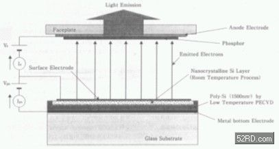 BSD釋放電子時是利用電子作熱激發(fā),使電子從基板下方注入NPS層,由于奈米結(jié)晶silicon的表面,是利用低溫氧化制程制成氧化薄膜,因此施加的電壓幾乎全部流入該氧化膜層內(nèi)進(jìn)而形成強(qiáng)電界領(lǐng)域,而氧化膜的厚度非常的薄,所以電子很容易將強(qiáng)電界領(lǐng)域的氧化膜變成tunnel,并進(jìn)入鄰接的奈米結(jié)晶silicon內(nèi),隨著電子通過氧化膜被加速,并朝向表面電極方向前進(jìn),如此反覆相同動作所以到達(dá)表面附近的電子,具備比熱平衡狀態(tài)更高的運(yùn)動能量,而表面電極也變得很容易將成為tunnel的電子釋放至真空中。