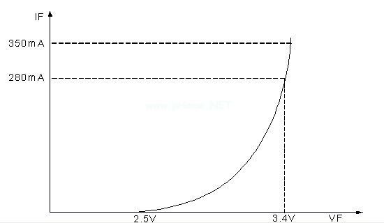 目前的新技術(shù)使LED能夠達(dá)到很高的功率水平,LED的功率能夠達(dá)到1W,甚至有些達(dá)到5W,光效達(dá)到60-85LM/W,這種LED設(shè)備稱為高亮LED(HB-LED)。目前我們用在照明上LED都是HB-LED,一般都是選擇1W的LED通過(guò)串并聯(lián)的方式組成大功率LED燈,尤其以串聯(lián)為主。這種LED的為3.4V±2%,正向電流為350mA左右。其-曲線如圖1.1所示。