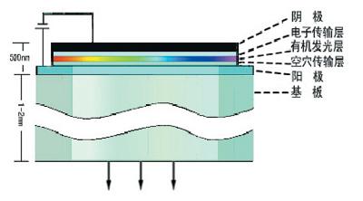 OLED是指有機(jī)半導(dǎo)體材料和有機(jī)發(fā)光材料在電場(chǎng)的驅(qū)動(dòng)下,通過載流子注入和復(fù)合導(dǎo)致發(fā)光的技術(shù)。其原理是用ITO玻璃透明電極和金屬電極分別作為器件的陽極和陰極,在一定電壓驅(qū)動(dòng)下,電子和空穴分別從陰極和陽極注入到電子傳輸層和空穴傳輸層,然后分別遷移到發(fā)光層,相遇后形成激子使發(fā)光分子激發(fā),后者經(jīng)過輻射后發(fā)出可見光。輻射光可從ITO一側(cè)觀察到,金屬電極膜同時(shí)也起了反射層的作用。下圖是一個(gè)簡(jiǎn)單的OLED器件結(jié)構(gòu)示意圖。