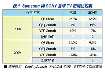 根據(jù)DisplaySearch研究指出,2009第三季全球電視品牌出貨金額排名與市佔(zhàn)率,三星皆為第一名,遠(yuǎn)勝暫居第三的SONY(見圖一),但是就三星現(xiàn)階段的作法來看,三星似乎不滿足,對(duì)於OLED TV與3DTV等產(chǎn)品線,三星集團(tuán)早已極積佈局。而就2010的CES展來看,三星推出65吋的3DTV,其中內(nèi)建3D處理器,可將2D內(nèi)容轉(zhuǎn)換成3D,同時(shí),三星也會(huì)推出藍(lán)光播放機(jī),同時(shí)支援3D內(nèi)容播放。