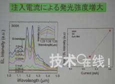 另外,該元件還呈現(xiàn)出如果增加注入電流、發(fā)光強(qiáng)度就會大幅提高的傾向,因此丸泉表示,“如果通過光子結(jié)晶形成共振器構(gòu)造,就應(yīng)該會產(chǎn)生激光振蕩。今后計劃將發(fā)光波長變更為可用于通信的1.5μm頻帶。將在2~3年后開發(fā)出作為光開關(guān)工作的元件,并實現(xiàn)實用化”。