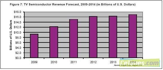 2009年電視半導(dǎo)體銷售額高達(dá)93億美元,由于液晶電視需要更多的半導(dǎo)體芯片支持各種高級功能,2010年銷售額有望更上層樓。iSuppli公司的預(yù)測顯示,2010年電視半導(dǎo)體市場將達(dá)到121億美元。